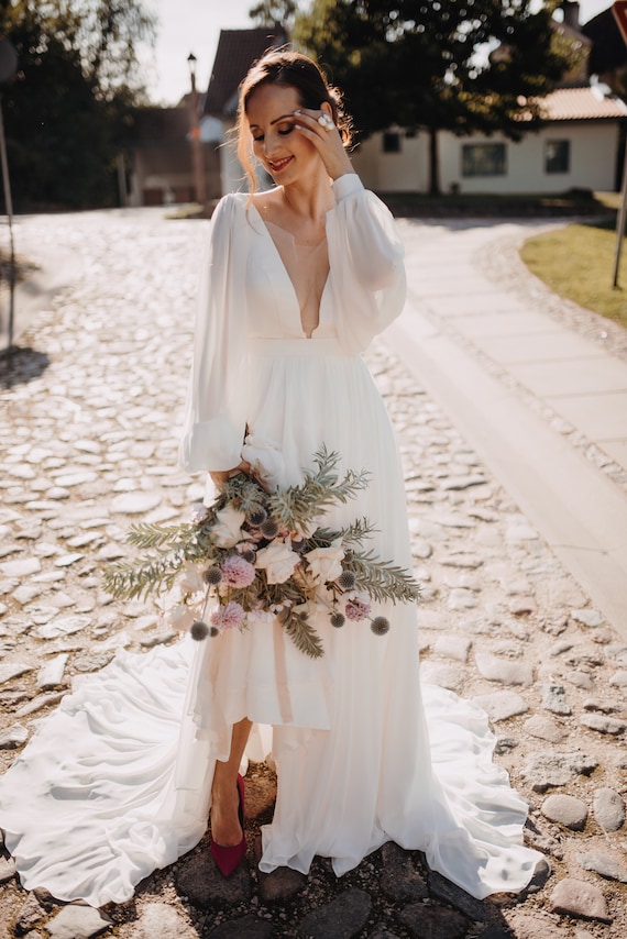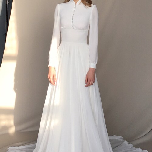 Long Sleeve Wedding Dress Chiffon Wedding Dress Button Up Etsy