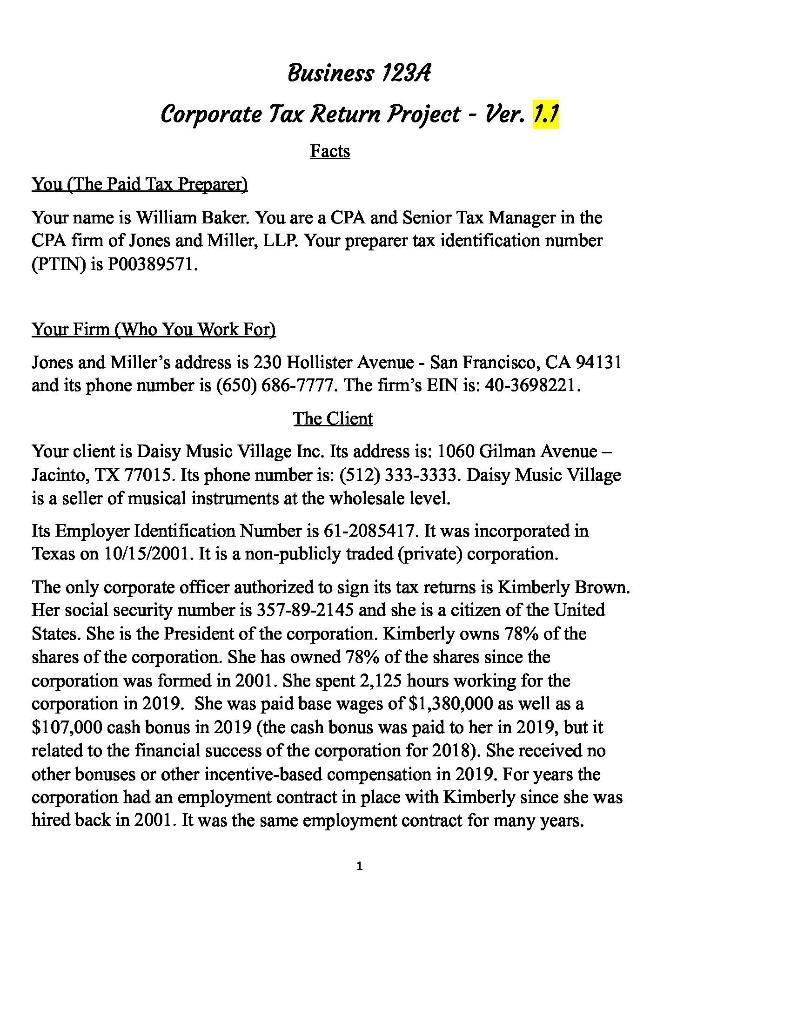 Business 123a Corporate Tax Return Project Ver 1 1 Chegg Com